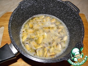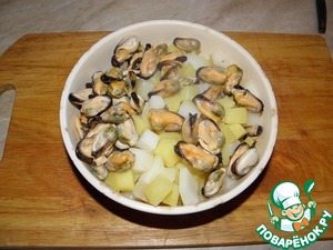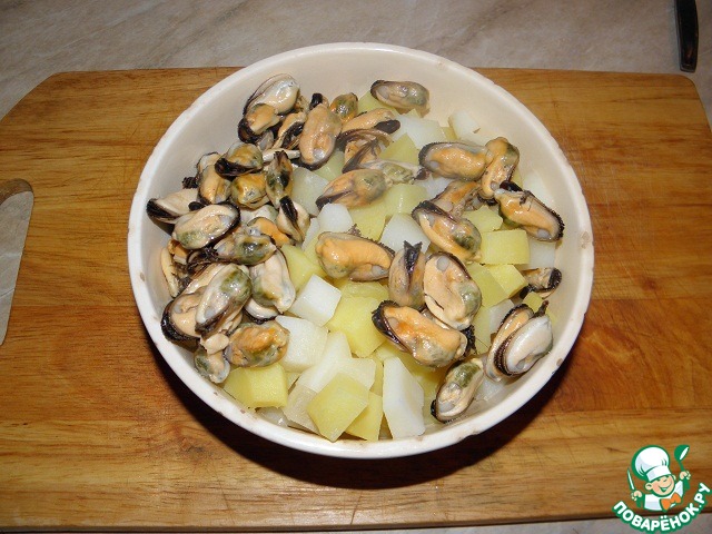 Добавить картофель и мидии. Варить 4 мин., снять с огня.