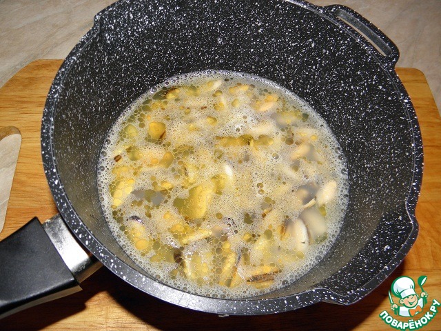 Мидии заранее разморозить в нижнем отделении холодильника. В кастрюлю влить стакан холодной воды, положить мидии, довести до кипения и снять с огня.