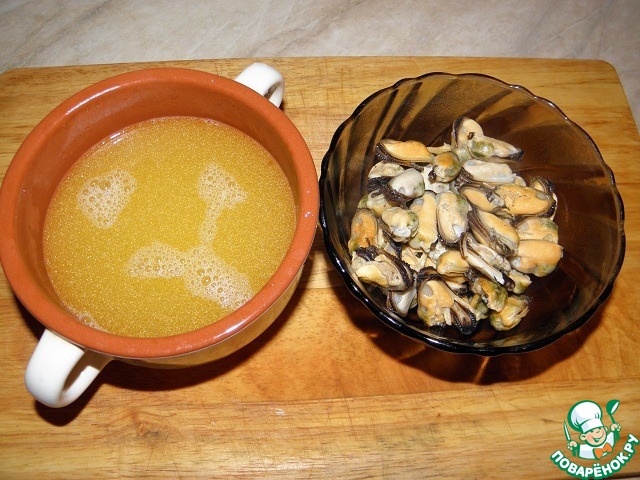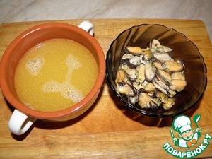 Полученный отвар процедить через сито. Мидии положить в миску, накрыть и отставить.