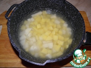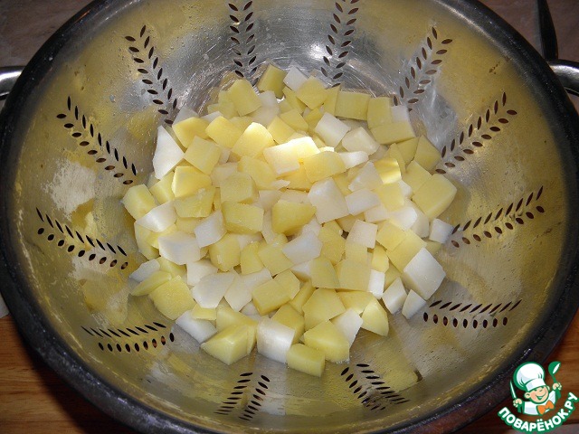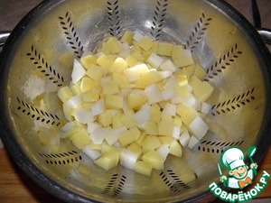 Картофель очистить, нарезать небольшими кубиками и отварить в течение 10 мин. в небольшом количестве воды.