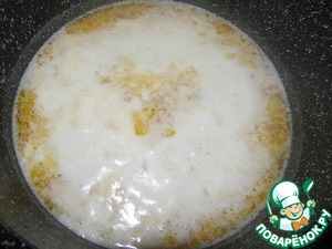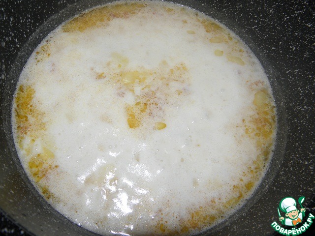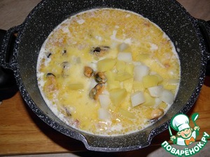 Молоко подогреть, не доводя до кипения. Влить в кастрюлю теплое молоко, стакан горячей воды и бульон от мидий. Проварить 5 мин.