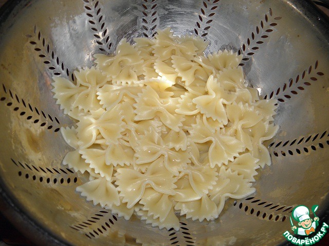 Фарфалле отварить в кипящей подсоленной воде до готовности (но не переваривать!), откинуть на дуршлаг.