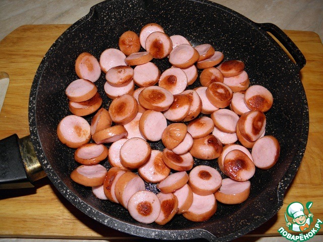 Сосиски нарезать кружками и обжарить на сковороде, постоянно помешивая, до образования румяной корочки, около 3-4 мин.