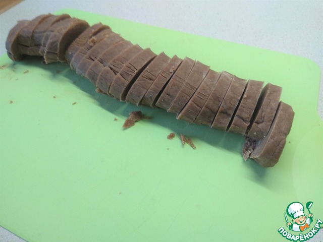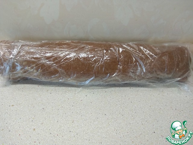 Тесто. Размягченное сливочное масло взбить миксером. Добавить сахар, какао. Затем желтки, соду погашенную уксусом. Постепенно добавлять муку. Скатать из теста колбаску, завернуть в пищевую пленку и положить в морозильник до застывания.