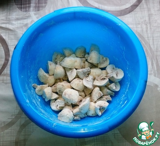 Шампиньоны перемешиваем со столовой ложкой крахмала, солим перчим.