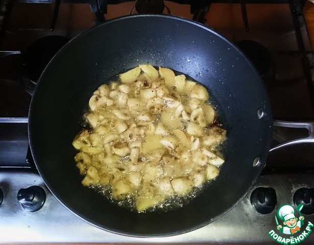 Когда масло хорошо раскалилось (будет заметно по имбирю, от него пойдут пузырьки), кладем в вок грибы и хорошенько их обжариваем, периодически помешивая.