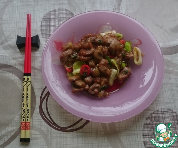 Перекладываем шумовкой грибы из вока в отдельную миску. Кладем в вок желудки. Обжариваем, хорошо помешивая.