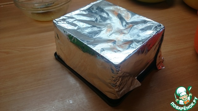 Подготовим формочки под задуманные продукты. У меня их не оказалось, поэтому я быстренько сделала из фольги. Подбираем подходящую емкость, переворачиваем ее. Фольгу складываем в 4 слоя и загибаем по форме. Края загнуть наружу.