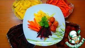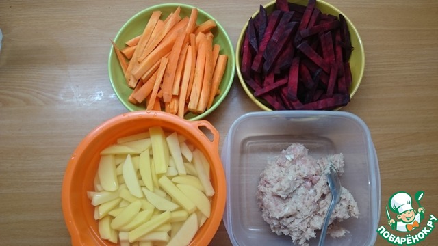 Морковь, свеклу, картошку чистим и режем на брусочки. Свеклу потоньше, если хотите чтобы приготовились все овощи одновременно. -