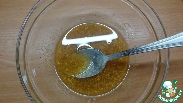 Готовим приправу для овощей. Смешиваем мед, растительное масло, воду, соль и специи (какие Вы любите или как у меня).