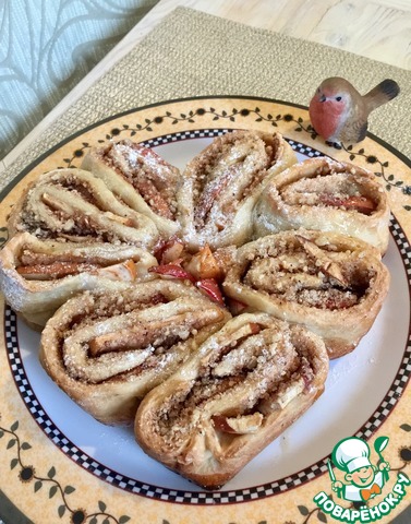 Между рулетиками вложить оставшиеся яблочные дольки.