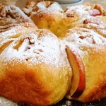 Подошедшее тесто выложить на присыпанную мукой рабочую поверхность, обмять, раскатать в пласт примерным размером 45*25 см. Визуально разделить тесто вдоль на четыре части. Верхнюю часть оставить свободной, на остальную поверхность теста разложить яблочные дольки (промокнуть бумажным полотенцем от лимонного сока) в три ряда по 7 штук на равном расстоянии друг от друга.