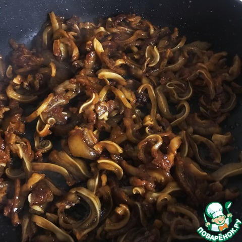 Берем сковороду с толстым дном, смазываем растительным маслом, и разогреваем ее пока не пойдет белый дым, это важный этап, если она не будет по максимуму разогрета-ушки склеятся. Высыпаем нарезанные ушки на сковородку, перемешиваем постоянно, ждем когда ушки начнут приобретать коричневый оттенок