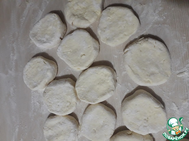 Всыпать муку, замесить некрутое немного липкое тесто. Выложить его на посыпанную мукой поверхность, скатать колбаску диаметром 5-6 см, разрезать на шайбочки толщиной 1 см, обвалять их в муке и оставить на 10-15 минут, чтобы разрыхлитель начал работать.