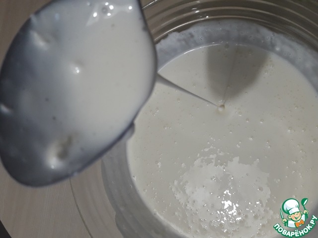 Всыпать 2 ст. л. сахара, 2 ч. л. разрыхлителя или 1ч. л. соды, щепотку соли. Если используете соду, гасить ее не нужно, достаточно просто хорошенько размешать.