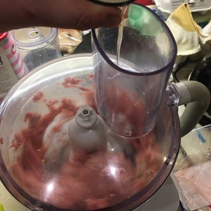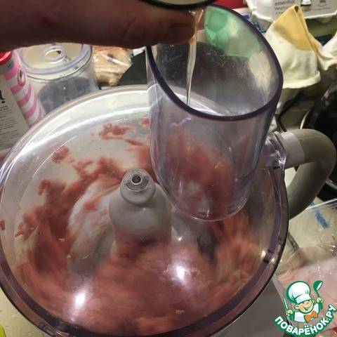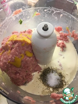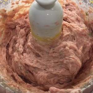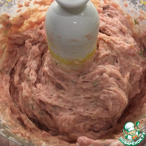 У меня было несколько стрелок зеленого лука с нижней луковичкой. Вместе с фаршем измельчил в чоппере (блендере) и добавил белки. Как следует это все прокрутил.