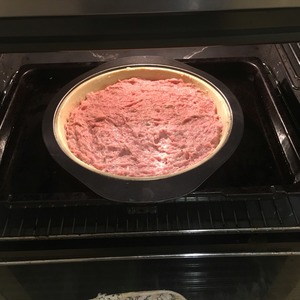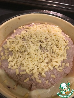 Через 25 минут как поставили в духовку, водяную баню и фарш достаем, аккуратно и быстро сливаем соки из круглой формы, посыпаем сверху сыром и уже без воды ставим на оставшиеся 5 минут в духовку.