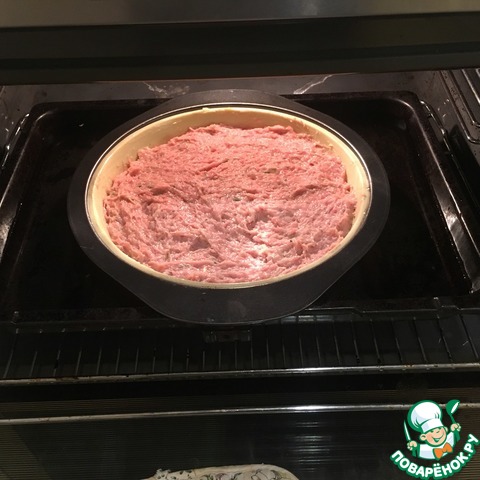 Смазал круглую силиконовую форму (20 см) сливочным маслом и выложил в нее весь фарш и аккуратно разровнял. Налил горячую воду в прямоугольную форму для выпекания и в нее поставил мою круглую форму, но вода не должна быть выше краев.