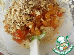 Всыпать муку с разрыхлителем, вымесить тесто лопаткой. Добавить к нашей массе рубленные грецкие орехи и цукаты вместе с сиропом, перемешать.