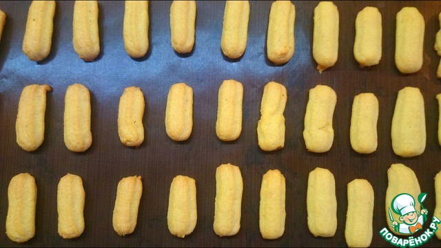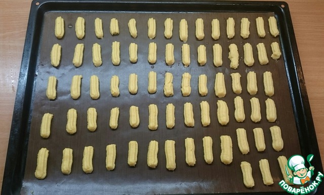 Дальше с помощью кулинарного шприца/ мешка формируем палочки. Длиной ~2см и толщиной с мизинец. У меня все заготовки поместились на одном противне.