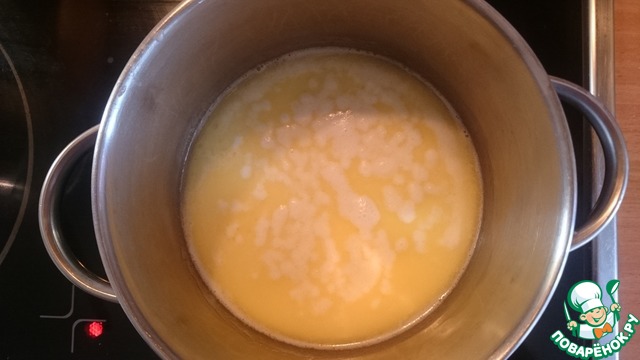 В кастрюлю наливаем молоко, выкладываем масло. На среднем огне доводим до кипения.