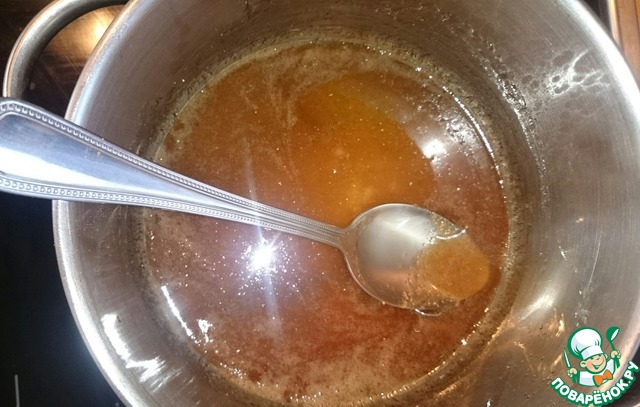 В кастрюлю наливаем 2 ст. л. воды, 2 ст. л. меда, добавляем сахар, корицу и имбирь. Периодически помешивая, доводим до кипения. После того, как сладкая масса закипит, варим еще 3-5 минут на слабом огне. -