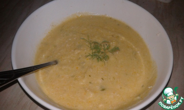 Бульон процеживаем, добавляем в него куриное и овощное пюре, укроп и хорошо перемешиваем.