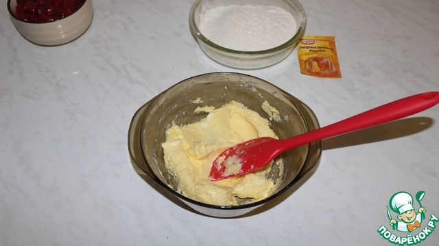 Добавляем муку с разрыхлителем. Быстро замешиваем тесто.