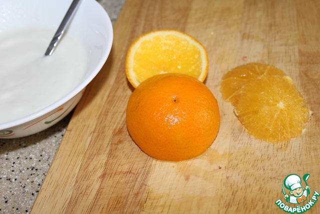 Сметану смешать с сахарной пудрой, можно не взбивать, просто дать постоять несколько минут и перемешать, апельсин разрезать пополам и ложкой достать мякоть, мелко нарезать.