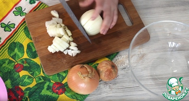 Подготовим лук: нарезаем его на небольшие кусочки. |