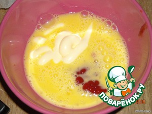 1яйцо взбить, добавить растопленный маргарин, майонез и кетчуп