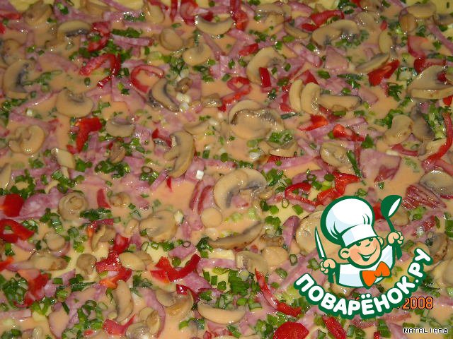 • Этой болтушкой залить пиццу и поставить в разогретую до 250*С духовку на 15 мин