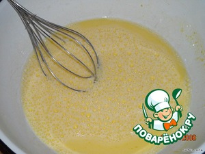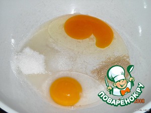 • 2 яйца, 2 ст.ложки сахара, 1 cт.ложка соли и 1 ст.ложка сухих дрожжей - все это взбиваем в миске венчиком