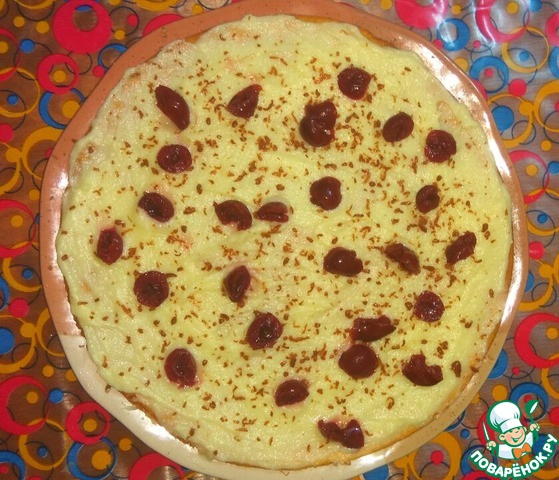 На блюдо кладем первый корж, на корж кладем 3-4 ст л крема, равномерно распределяем крем по коржу. На крем выкладываем разрезанные пополам вишни. И посыпаем тертым шоколадом.