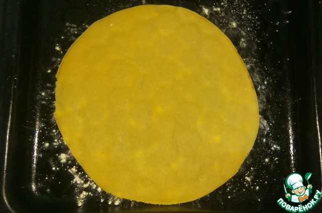 Противень для выпечки присыпать мукой, выложить раскатанный корж. Обычно, когда выпекают коржи, всегда перед выпечкой корж протыкают вилкой по всему периметру, чтоб он не вздувался. Я этого не делаю, так как коржи раскатываю очень тонко, сильно они не вздуваются при выпечке.