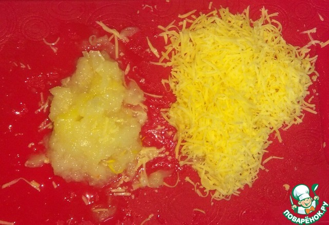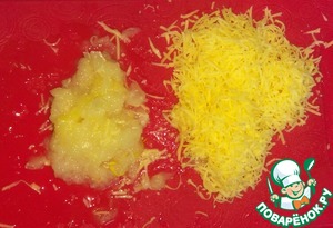 Сыр и лук натереть на мелкую терку. Жидкость образовавшуюся от лука слить.