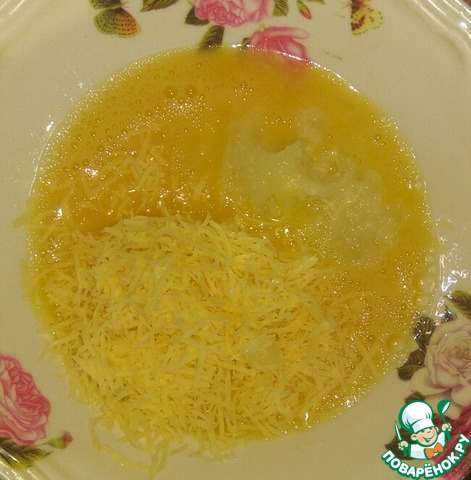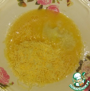 Вилкой взбить яйца с щепоткой соли. Добавить сыр и лук, перемешать.