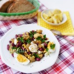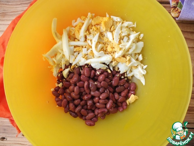 В салатник выкладываем фасоль (жидкость предварительно сливаем) и нарезанные соломкой яйца.