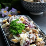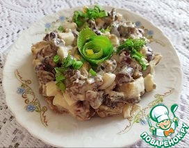 Рецептом этого салата когда-то давно поделилась со мной моя тётя - большая затейница по части кулинарии. В её оригинальном рецепте шампиньоны были консервированные и салат готовился в считанные минуты. Со временем, прочувствовав, так сказать, вкус и консистенцию, я пришла к выводу, что вкуснее всего этот салат будет со свежими обжаренными шампиньонами! Предлагаю вам мой вариант вкусного, сытного салата!