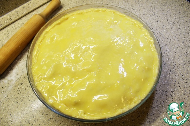 Тесто разделила на две половины, одна чуть больше другой. Большую положила не дно смазанной растительным маслом формы, сформировала бортики.