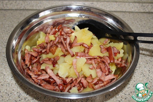 Смешала аккуратно нарезанный картофель с поджаренным беконом.