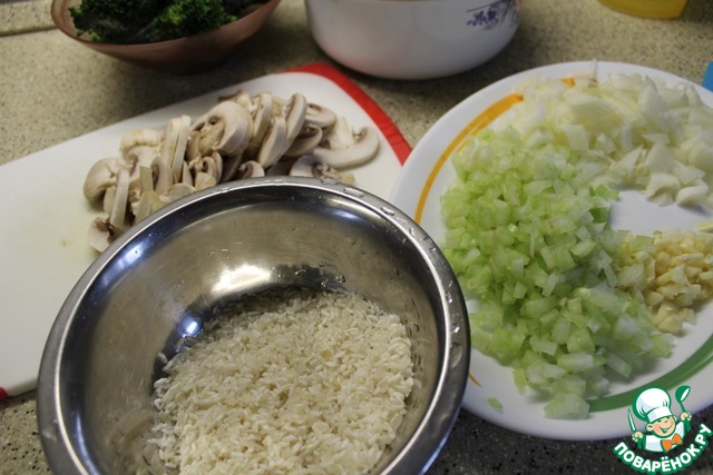 Рис промыть, грибы нарезать пластинами, лук, чесноки сельдерей мелко.