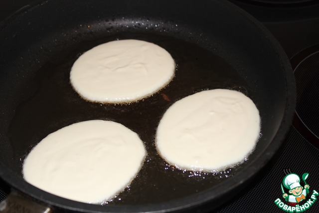 Жарить оладьи на среднем огне, наливая тесто частями, как обычно с двух сторон до золотистого цвета, примерно по паре минут м каждой стороны.