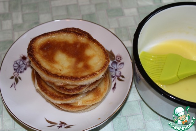 Разогреть в небольшой кастрюле сливочное масло и укладывать оладьи стопкой, смазывая каждый.