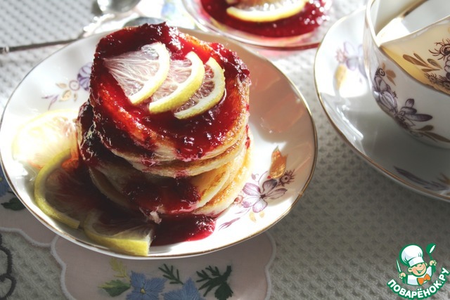 Полить стопки из оладьев сверху ягодным соусом (предварительно смешав разбавленное варенье с лимонным соком), украсить кусочками лимона.