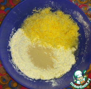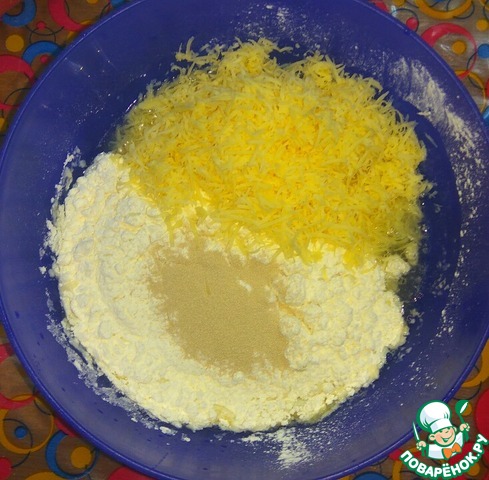 Добавить натертый на мелкую терку сыр, дрожжи и муку, замесить мягкое, немного липкое тесто. Руки можно смазать растительным маслом, чтоб легче замешивалось тесто. Оставить тесто на расстойку на 1,5 часа.