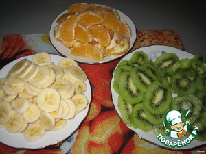 Сверху выкладываем дольки апельсинов, чередуя с ломтиками киви. -