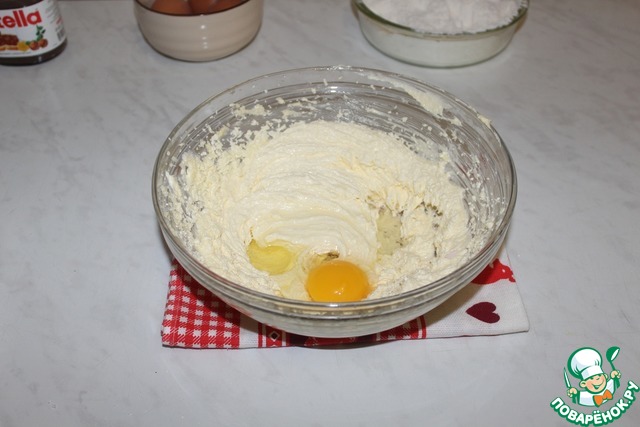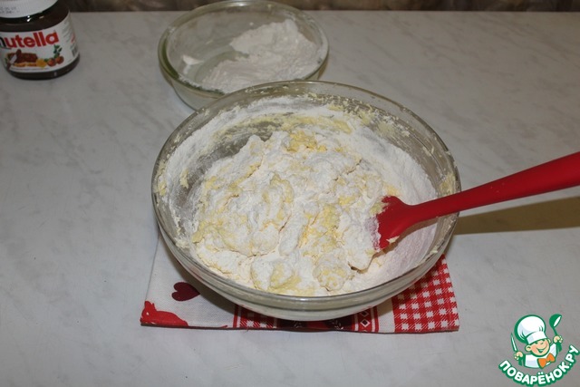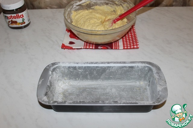 В форму выкладываем 1/3 теста. Сверху выкладываем половину шоколадной пасты нутелла.