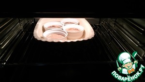 В форме для выпечки расставить рамекины (вместо рамекинов можно использовать фаянсовые кофейные чашки, небольшие порции десерта порадают тех кто следит за фигурой). Заполнить их шоколадной смесью ( я обычно заполняю рамекины на половину). Наполнить форму для выпечки кипятком так чтобы вода доходила до середины рамекинов.