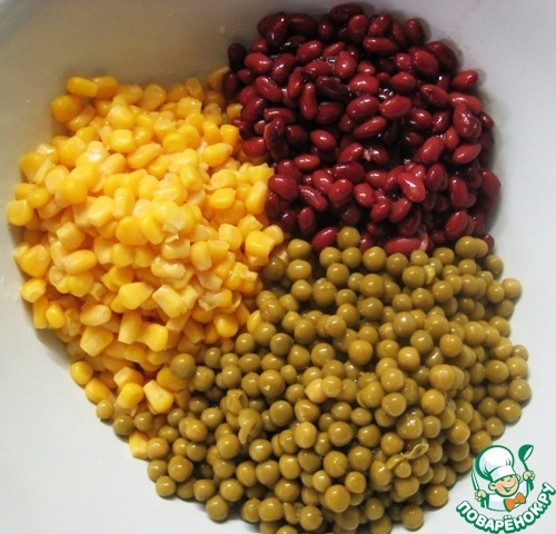 С консервированных горошка, фасоли и кукурузы слить жидкость. Соединить в миске.